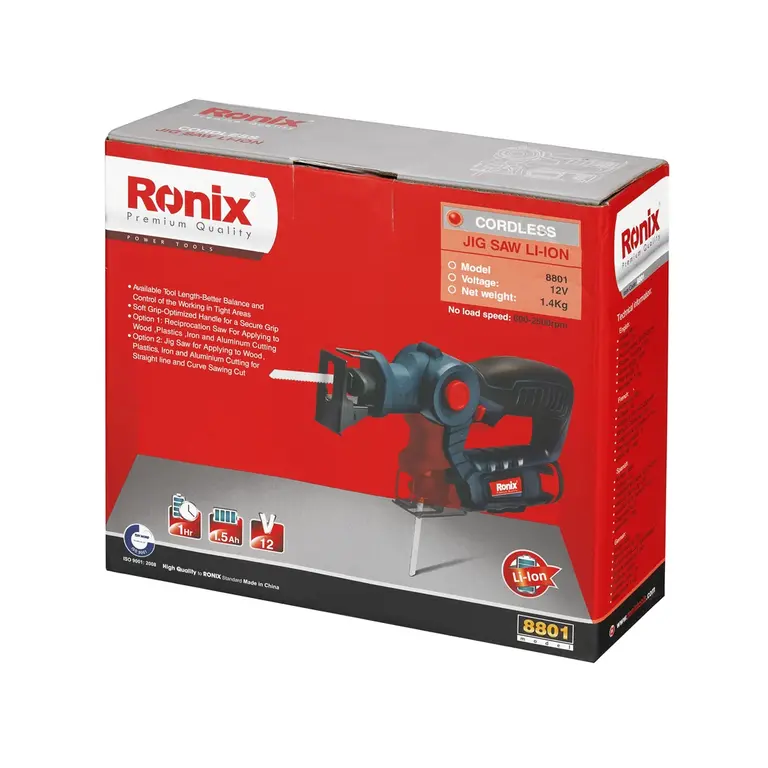 اره چکشی شارژی رونیکس 8801 با استفاده از باتری لیتیوم-یون ۱۲ ولت و ظرفیت ۱.۵ آمپر ساعت، آزادی عمل کاملی را به کاربر می‌دهد. تکنولوژی لیتیوم-یون (Li-ion) مزایای متعددی نسبت به باتری‌های قدیمی‌تر دارد، از جمله عدم وجود اثر حافظه (Memory Effect) و توانایی حفظ شارژ در حالت استندبای برای مدت طولانی‌تر.