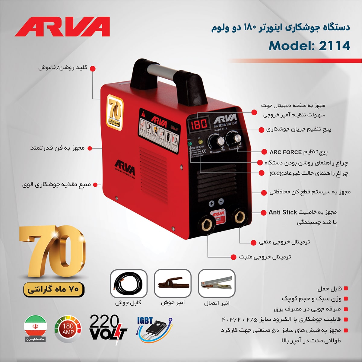 اینورتر جوشکاری ۱۸۰ آمپر IGBT آروا مدل ۲۱۱۴ یک دستگاه جمعوجور و حرفهای است که برای مصارف خانگی و کارگاههای کوچک طراحی شده است. این دستگاه قادر است جریان خروجی بین ۲۰ تا ۱۸۰ آمپر تولید کند و با ولتاژ تکفاز ۲۲۰ ولت و فرکانس ۵۰ تا ۶۰ هرتز کار میکند. تکنولوژی IGBT و سیستم PWM به کار رفته در این دستگاه، عملکرد پایدار و یکنواخت جوشکاری را تضمین میکند و از ایجاد پرش جریان جلوگیری میکند.
