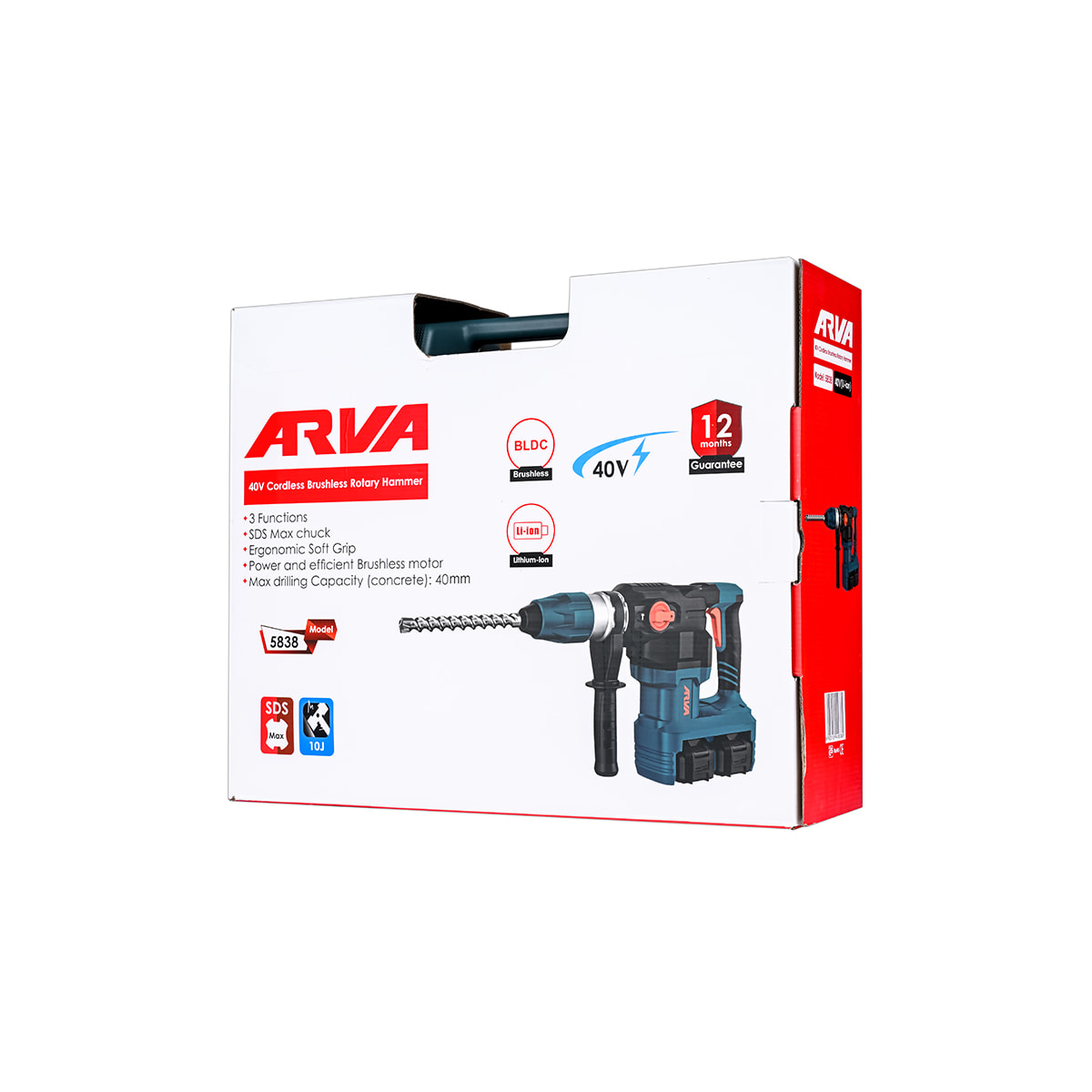 بتن کن آروا مدل ۵۸۳۸ دارای طراحی ارگونومیک بدنه و دسته است که آزادی عمل و راحتی کار طولانی را تضمین میکند. دسته با روکش نرم، ضد تعریق و ضد لرزش، کنترل دقیق ابزار را ممکن میسازد. موتور براشلس با راندمان و طول عمر بالا، عملکردی پایدار و حرفهای ارائه میدهد. ابزارگیر ۵ شیار (SDS-MAX) تعویض سریع سریها را آسان کرده و چراغ LED و نشانگر شارژ باتری کاربری دقیق و ایمن را ممکن میسازد.