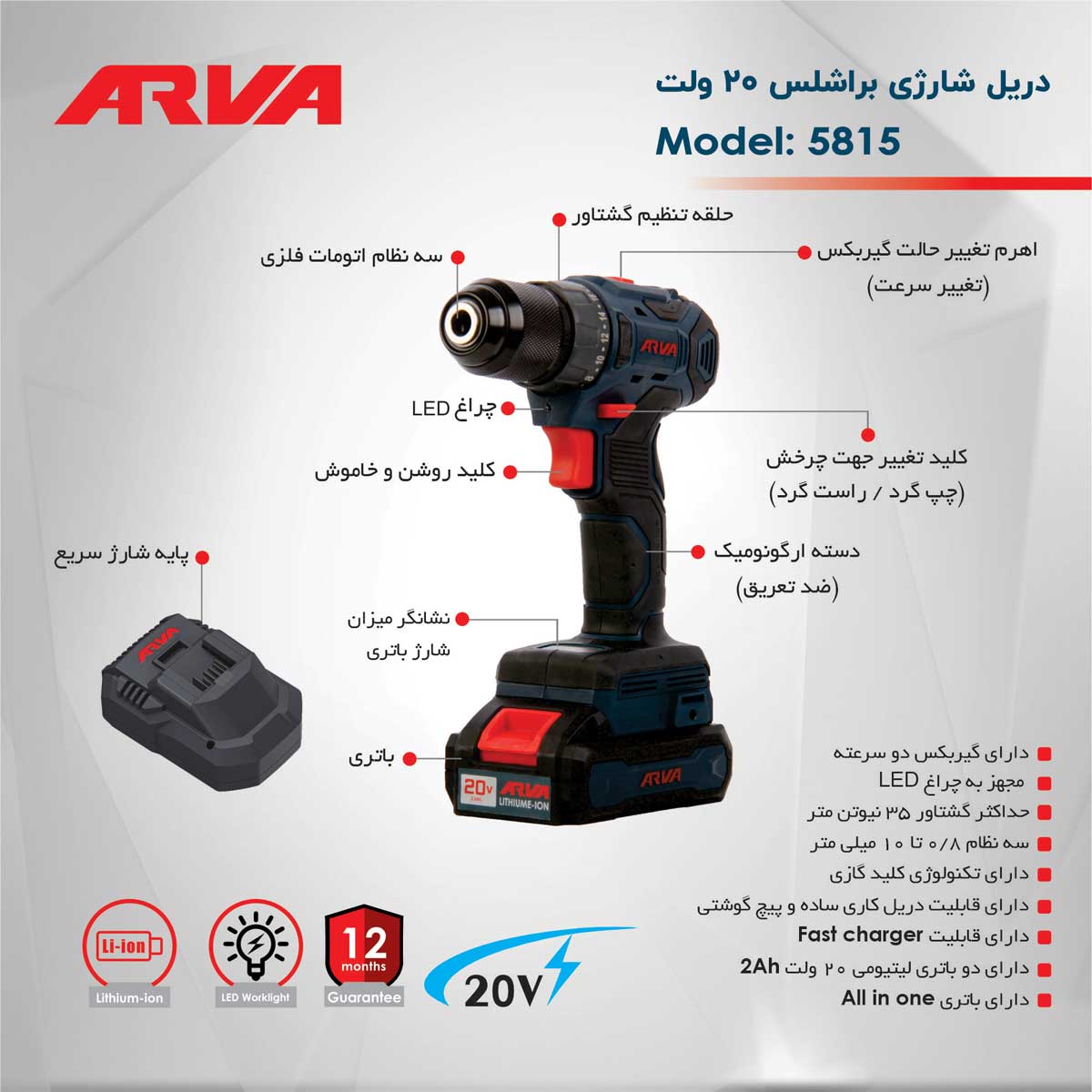 دریل پیچ گوشتی شارژی براشلس ۲۰ ولت آروا مدل ۵۸۱۵