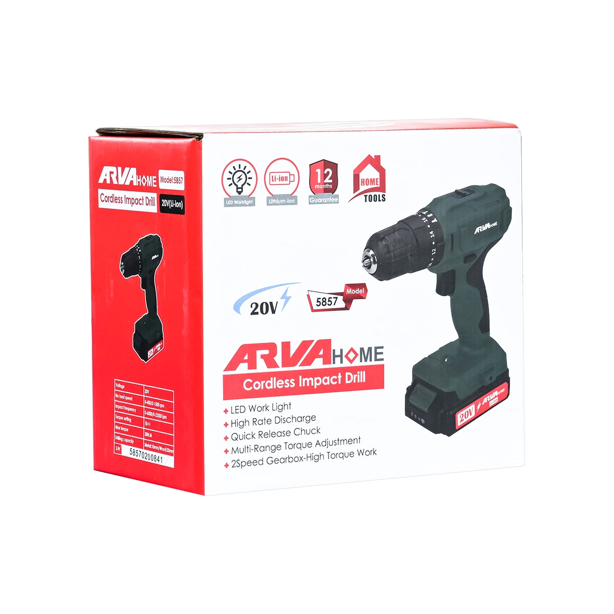 دریل شارژی آروا مدل ۵۸۵۷ دو حالت سرعت ۰ تا ۴۰۰ دور در دقیقه و ۰ تا ۱۵۰۰ دور در دقیقه دارد و گشتاور آن تا ۳۰ نیوتن‌متر قابل تنظیم است. حداکثر ظرفیت سوراخ‌کاری در فلز ۱۰ میلی‌متر و در چوب ۲۰ میلی‌متر است که این ابزار را برای اکثر پروژه‌های خانگی و نصب وسایل مناسب می‌کند. همچنین این دستگاه مجهز به حالت سوراخ‌کاری چکشی است که امکان کار روی مصالح سبک را فراهم می‌کند. با داشتن دو باتری شارژی، می‌توان بدون توقف پروژه‌ها را ادامه داد.