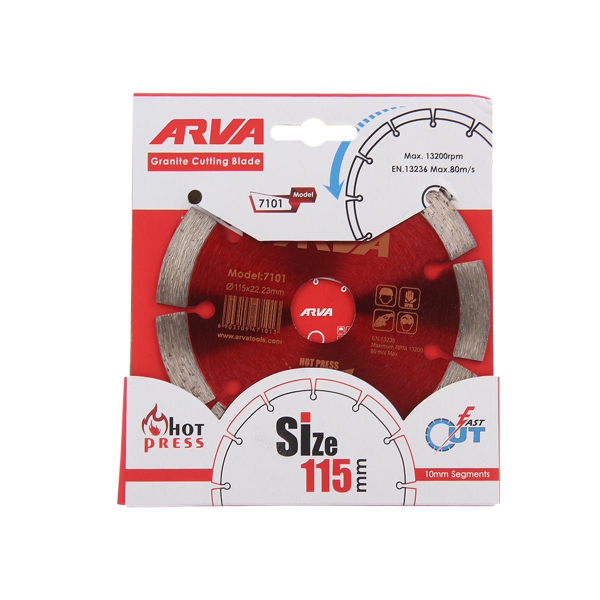 صفحه گرانیت بر مینی ۷۱۰۱ دارای قطر خارجی ۱۱۵ میلیمتر و قطر داخلی ۲۲.۲ میلیمتر است. سگمنتهای بلند با ارتفاع ۱۰ میلیمتر باعث افزایش طول عمر صفحه و برش سریعتر میشوند. طراحی صفحه مطابق استاندارد EN 13236 انجام شده و تکنولوژی Hot Press باعث چسبندگی بالای ذرات ساینده و مقاومت مطلوب آن میشود. این ساختار باعث کاهش سایش، مقاومت در برابر حرارت و حفظ دقت برش در طول عملیات میشود.