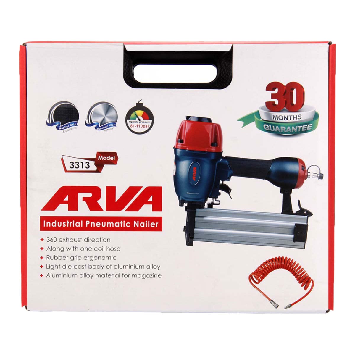 میخکوب بادی آروا ۳۳۱۳ قابلیت شلیک میخهایی با اندازه ۱۸ تا ۶۴ میلیمتر را دارد و با فشار کاری ۸۱ تا ۱۱۰ PSI بهترین عملکرد را ارائه میدهد. ظرفیت خشاب آن ۵۰ عدد میخ است و به دلیل سرعت و قدرت شلیک بالا، برای پروژههایی که حجم کار زیاد دارند بسیار مناسب است.