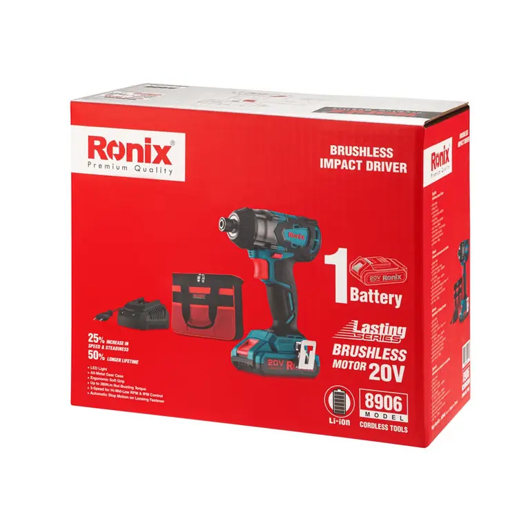 پیچگوشتی چکشی شارژی 20 ولت رونیکس مدل 8906 با موتور براشلس کماستهلاک، بدنه فوق مقاوم PA6/GF30 و قابلیت تنظیم سهحالته سرعت و ضربه، یک انتخاب عالی و سرمایهگذاری مطمئن برای کاربردهای صنعتی سنگین محسوب میشود که دوام و قدرت را در یک پکیج سبکوزن ارائه میدهد.