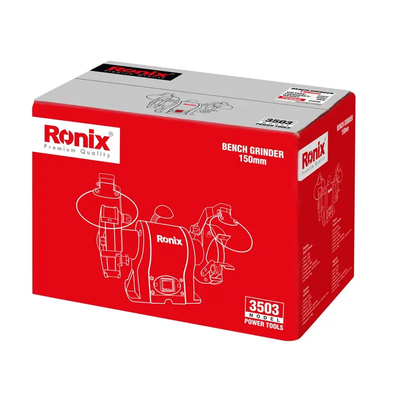 رونیکس مدل 3503 در بستهبندی مقاوم و اختصاصی خود عرضه میشود که شامل دستگاه چرخ سنباده، محافظ چشمی، دو صفحه سنباده در سایزهای مختلف و دفترچه راهنما است. بستهبندی این محصول بهگونهای طراحی شده که دستگاه در حملونقل کاملاً ایمن باقی بماند.